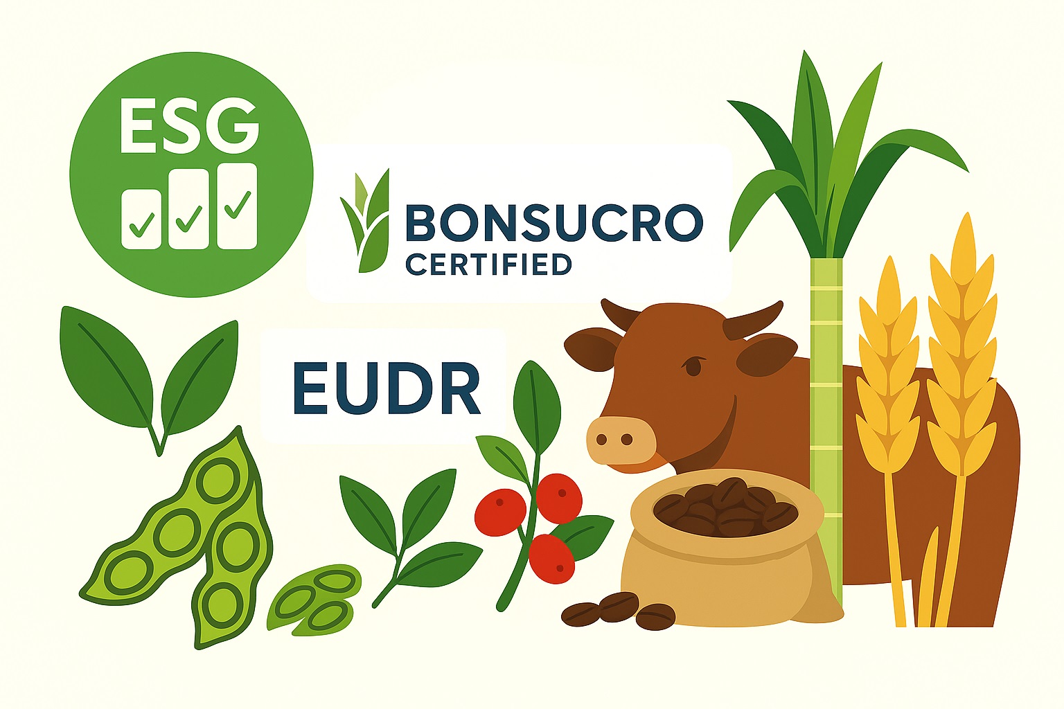 Trazabilidad de soya, azúcar, café y carne bovina, garantizando cumplimiento ESG y certificaciones internacionales como Bonsucro y EUDR.